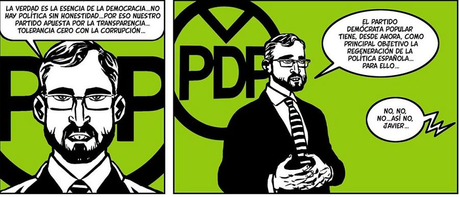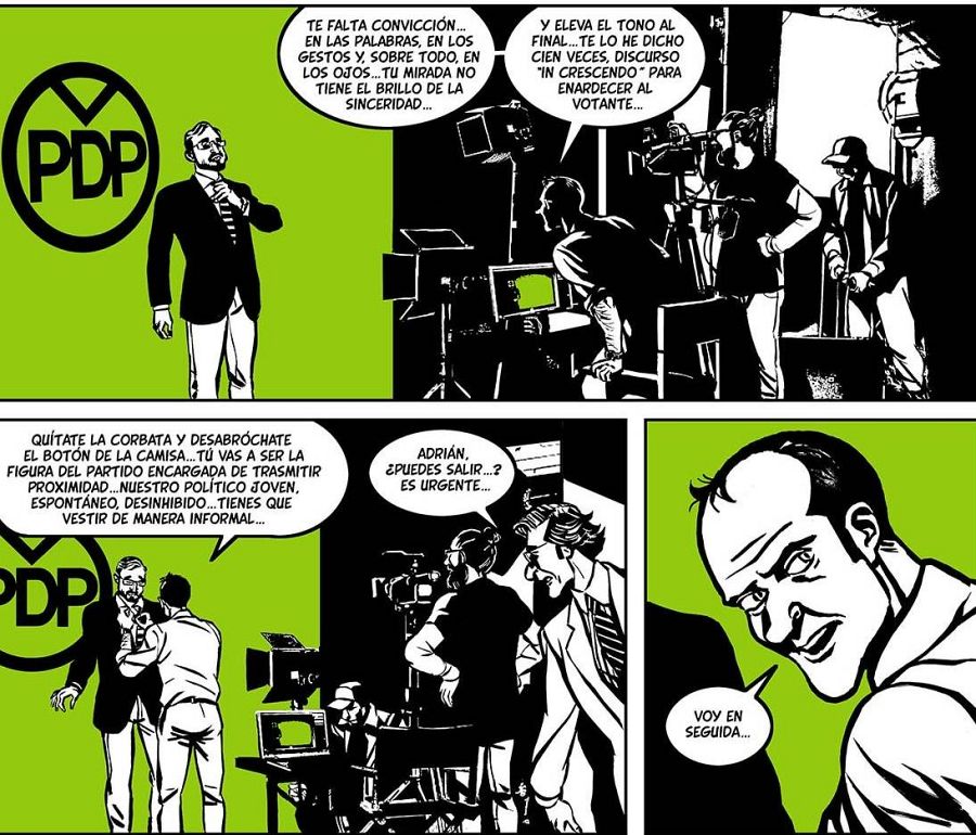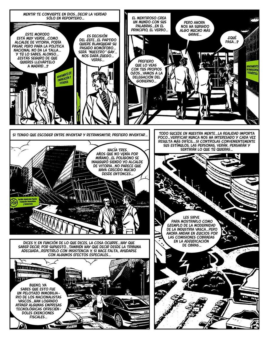 “Pero me gustaría aclarar –continúa el guionista-, que este cómic no está protagonizado por las primeras figuras de la política nacional, aunque también aparezcan, sino que nos hemos centrado en el segundo nivel de la política, esas legiones de consejeros, de asesores, de comunicadores, especialistas en imagen… que son los que se encargan de escribir los discursos, de decidir en qué temas hay que poner el foco, cómo se puede distraer la atención sobre cosas que pueden perjudicar al partido poniendo el foco en otras… Esa segunda línea de la política que es la que fabrica la mentira para que los políticos de primera fila la repitan en los diferentes medios".