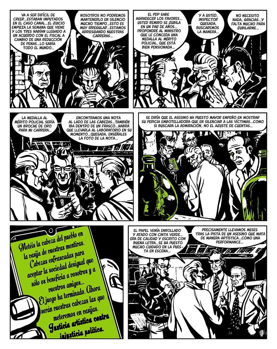 “Esta semana lamentamos la muerte de John Le Carré -añade Keko-, y creo que fue él quien dijo que “solo a través de la ficción se puede contar la verdad”. Y nosotros intentamos contar la verdad sobre la España de estos últimos años. Lo curioso es que parece que hablamos del pasado, pero todo lo que contamos es carne de Telediario estos días. Con los juicios de la mafia policial, la operación Kitchen, el Caso Gürtel… Ese trasfondo real que supera con creces a nuestro cómic”.