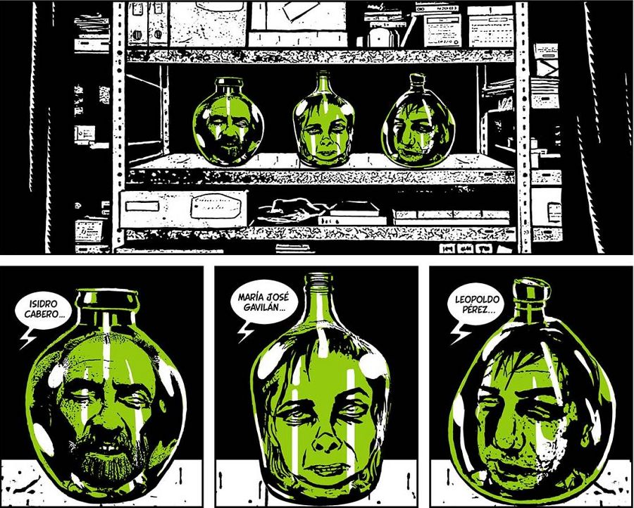 “En un comentario de Facebook -interrumpe Altarriba- alguien comentaba que habíamos elegido muy bien el verde porque verde se parecía a “verdad”, pero es una cosa que habíamos pensado. También leí en algún sitio que el verde era un color mentiroso porque era un azul mezclado con amarillo… Creo que cumple la misma función que en los anteriores, un verde fosforito, que va muy bien con el blanco y negro y que cada vez que aparece te está diciendo: “mentira, mentira, mentira…”