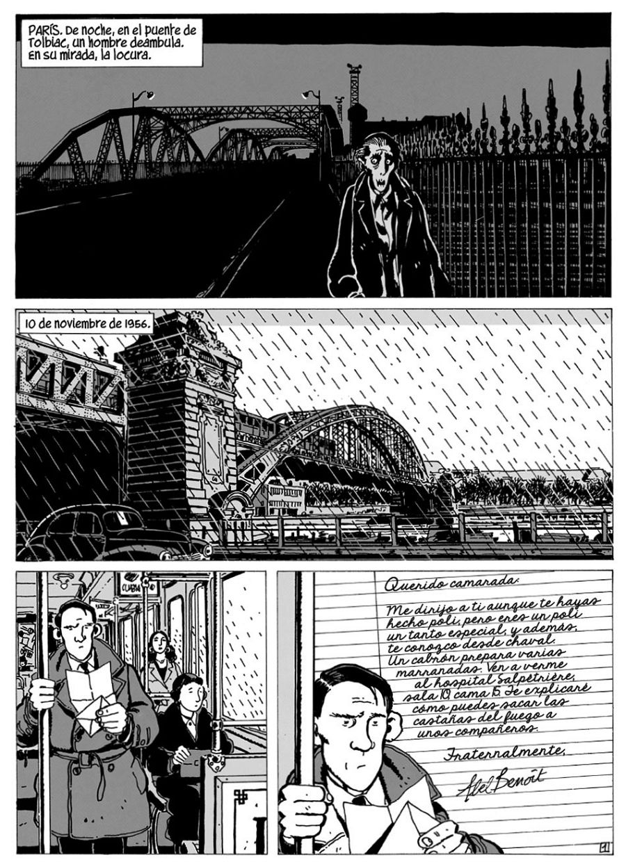 Por eso, más que una historia en blanco y negro es una historia llena de grises, con personajes complejos y cuyos argumentos comprendemos, aunque no estemos de acuerdo con ellos. Unos grises que Tardi refleja como nadie con sus maravillosos dibujos en los que los personajes siempre parecen a punto de ser devorados por esos grises, por esa niebla del puente Tolbiac, que da nombre a su primera historia.