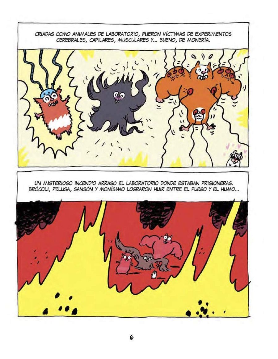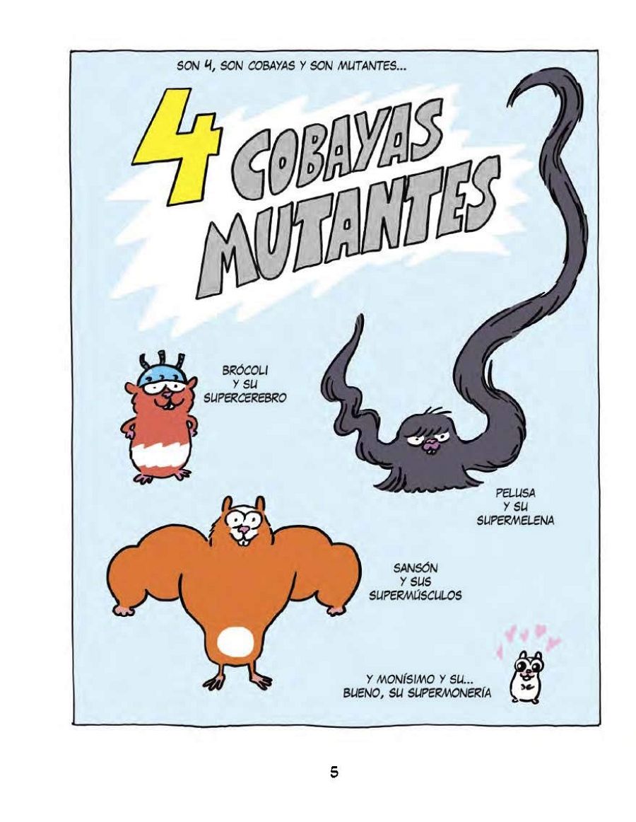 Artur Laperla nos presenta a los cuatro protagonistas que nos conquistan desde la primera página: "Los protagonistas son 4 cobayas que han logrado huir de un laboratorio dónde estaban sometidas a experimentos. A raiz de esos experimentos cada una de ellas ha desarrollado un poder o habilidad. Así tenemos a Brócoli, que es la lista, a Pelusa que tiene un pelo superfuerte y superextensible, a Sansón que es el forzudo y a Monísimo y su súpermonería. Además cada una de las cobayas tiene un carácter diferenciado lo que provoca que pueda haber roces entre ellas".