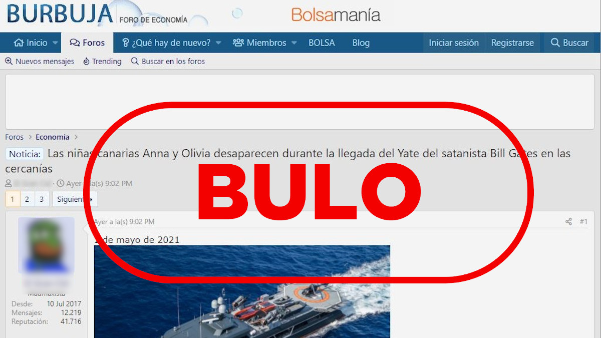En un foro donde habitualmente se comparten falsedades, un usuario asegura: “Las niñas canarias Anna y Olivia desaparecen durante la llegada del Yate del satanista Bill Gates en las cercanías”. En Telegram también hemos encontrado la misma tesis, que se expone mediante la publicación concatenada de dos mensajes, cada uno con una imagen. En la primera se ve a las pequeñas con el texto: “Fotos de las niñas desaparecidas en Tenerife que su madre nos pide que difundamos”. En la segunda aparece el yate Wayfinder -que puedes ver en este vídeo-, con el texto: “Yate de Bill Gates de esta semana atracado en Tenerife”.