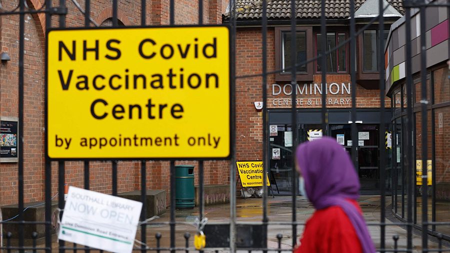 Una mujer con mascarilla pasando frente a un centro de vacunación en Ealing.
