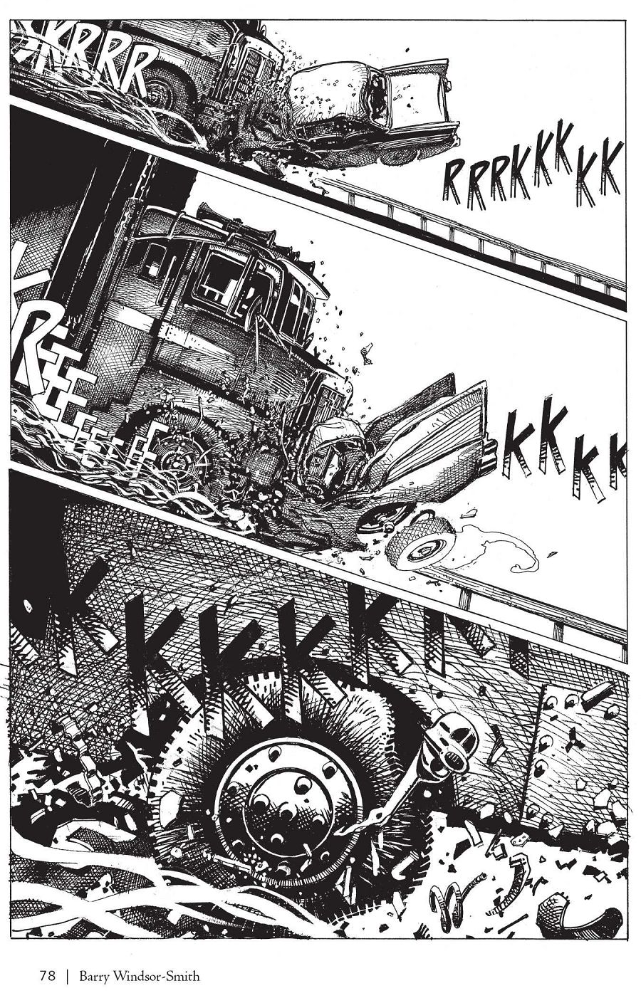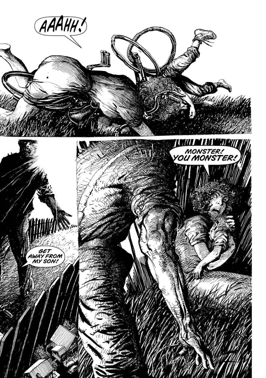 Podéis abrir el libro por cualquiera de sus páginas y quedaréis deslumbrados por el arte de Barry Windsor -Smith. Y eso que se nota que ha huido del virtuosismo innecesario para centrarse en la historia y la narración (por ejemplo, apenas hay dibujos a página completa). Pero más allá de ese impactante poderío visual, subyace una historia apasionante que nos hace reflexionar sobre esos temas que he mencionado y sobre muchos otros más. Una historia, en definitiva, sobre monstruos muy humanos y humanos muy monstruosos.