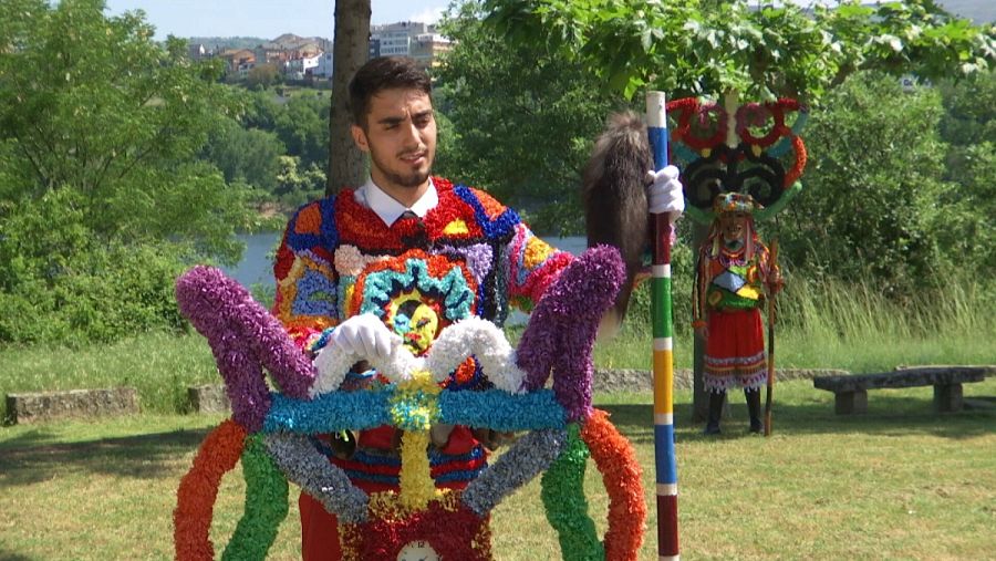 El alma de Viana do Bolo es su carnaval, el Entroido. Una festividad que, si bien se celebra en toda Galicia, en esta localidad encuentra unas tradiciones y costumbres únicas. Si hay algo que la diferencia en esta localidad del resto de la comunidad autónoma es la figura del Boteiro, un bailarín tradicional encargado de abrir paso por las calles para el paso de las comitivas y las charangas. Para ello, el Boteiro hace uso de su colorido vestuario, una camisa de cintas trenzadas con las que compone formas y cenefas a gusto del bailarín. "Al estar cosidas la camisa del Boteiro puede llegar a tener hasta 2 o 3 kilómetros de cinta", explica Ángel Macías, el joven escondido tras el traje. "Era tradición en Viana que las madres y las hermanas ayudasen a los Boteiros a hacer sus camisas", recuerda Macías.