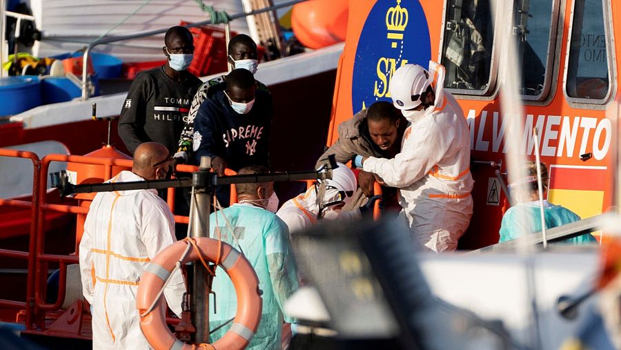 Inmigrantes desembarcando en el Puerto de Los Cristianos, Tenerife.