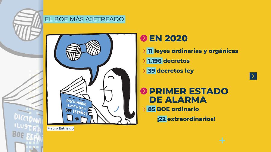 Todo pasa por el Boletín Oficial del Estado (BOE). Hasta si puedes bailar (o no) en una discoteca. El diario, que arrastró su nombre original de Gaceta de Madrid hasta el final de los años 80, siempre ha sido importante, pero, en la pandemia, se ha vuelto indispensable. Esa relevancia, sin embargo, no se ha traducido en accesibilidad. Es lo que aseguran la periodista especializada en "lo público", directora de la Fundación Civio, Eva Belmonte, y el dibujante Mauro Entrialgo, que a modo de enciclopedia humorística pretenden "democratizar" el acceso a texto diario dedicado a la publicación de leyes y disposiciones. ¿Su herramienta para llevar a cabo esta tarea? El 'Diccionario ilustrado BOE - español' que acaban de publicar y que hemos podido repasar en 'La Hora de La 1'.