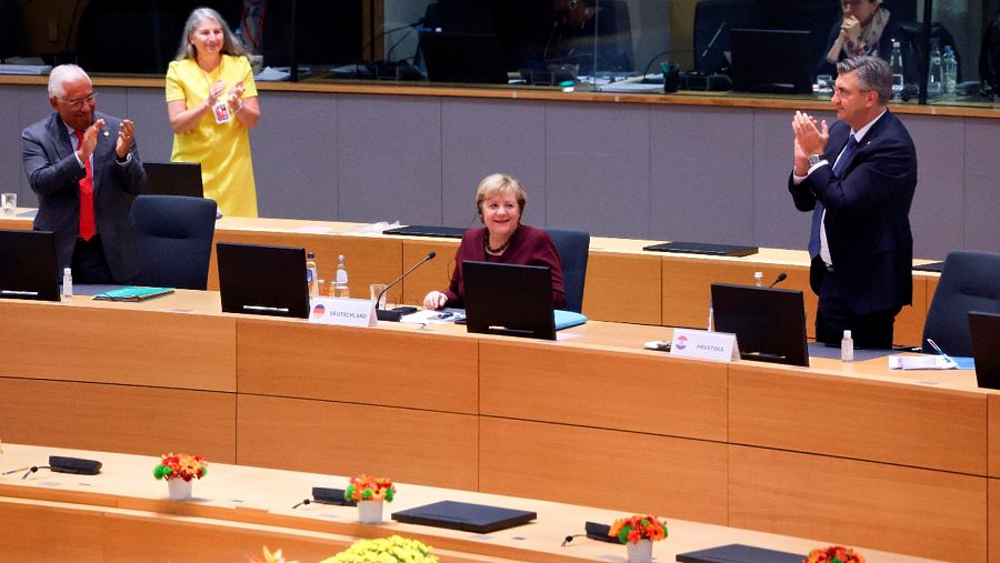 Una imagen del momento en el que los líderes europeos ovacionan a Merkel.