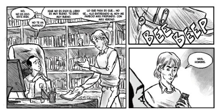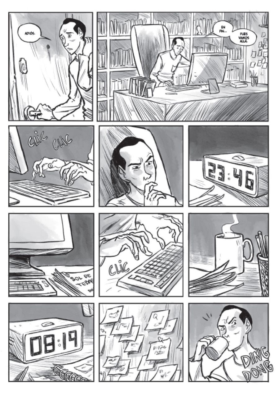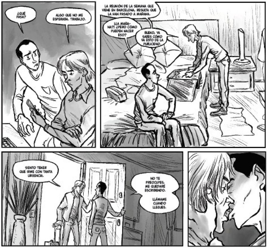 "Por un lado tenemos la parte emocional -continúa el guionista-, la que nos habla de la relación de Manuel y Álvaro y, en ocasiones, del trasfondo personal de otros personajes. Luego está la parte detectivesca, el misterio de la muerte de Álvaro y la posterior investigación. Me centré en esta última parte y es la que aparece en el cómic, si bien también hay momentos en que hablamos de la relación de Álvaro con su familia y con Manuel, y de la profunda decepción de este al descubrir que Álvaro le ha estado mintiendo".