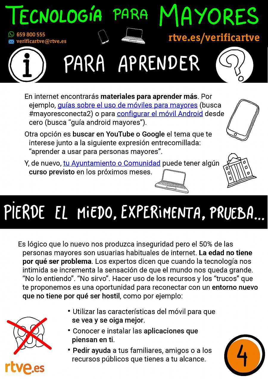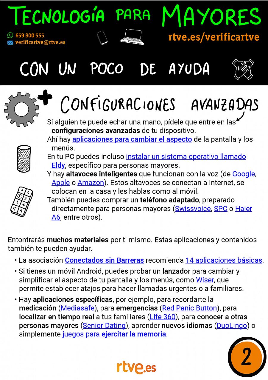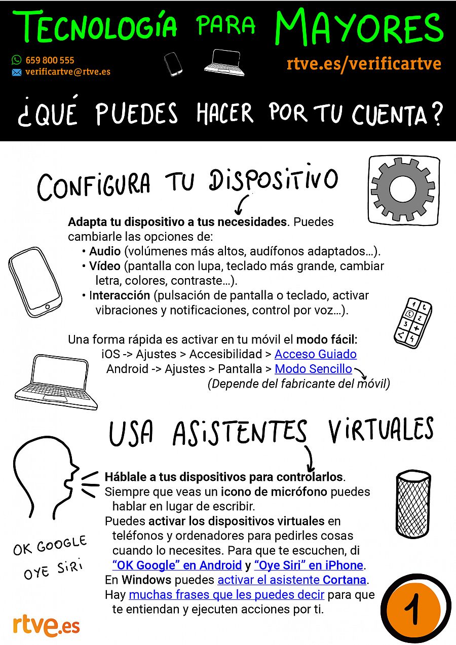 Aprovechando la Semana Mundial de la Alfabetización Mediática e Informacional que se celebra a nivel mundial, hemos preparado estas fichas explicativas con algunas claves para que nuestros mayores puedan usar la tecnología digital de manera lo más autónoma posible. Damos pistas sobre qué puedes hacer por tu cuenta para configurar tu dispositivo y usar asistentes virtuales que se activan mediante la voz, configuraciones más avanzadas que se pueden hacer con un poco de ayuda de gente cercana o asociaciones y entidades locales, y algunos recursos para aprender más y, sobre todo, perder el miedo. Además, al final hay una lista de frases que se pueden usar en asistentes virtuales.