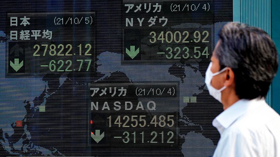 Un hombre mirando una pantalla con información del índice bursátil Nikkei.