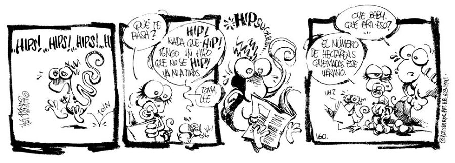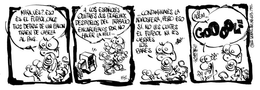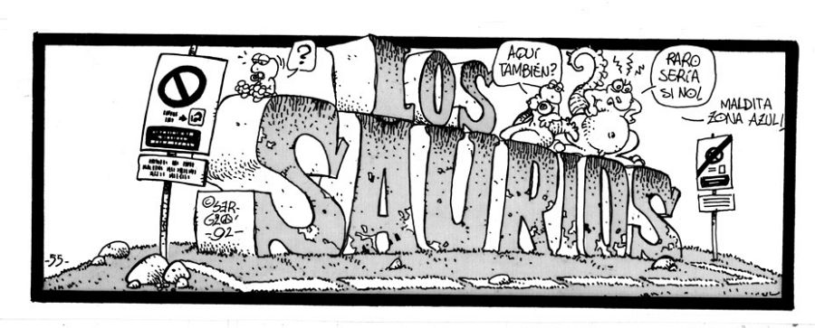 A veces es problemático recuperar tiras de prensa porque están ligadas a noticias de actualidad. "En las tiras de Los saurios -asegura Sergio- usé todo tipo de temas, siempre con un espíritu crítico, antimilistarista y ecologista. Desde cosas muy localistas como la llegada de la zona azul a las calles de Albacete, La Feria o los graffittis, hasta temas nacionales como la proliferación de grupos de skinheads, los incendios forestales, los juicios a insumisos o los atentados de ETA. A veces también temas de alcance internacional como la guerra de Bosnia o la del Golfo Pérsico e incluso el SIDA".