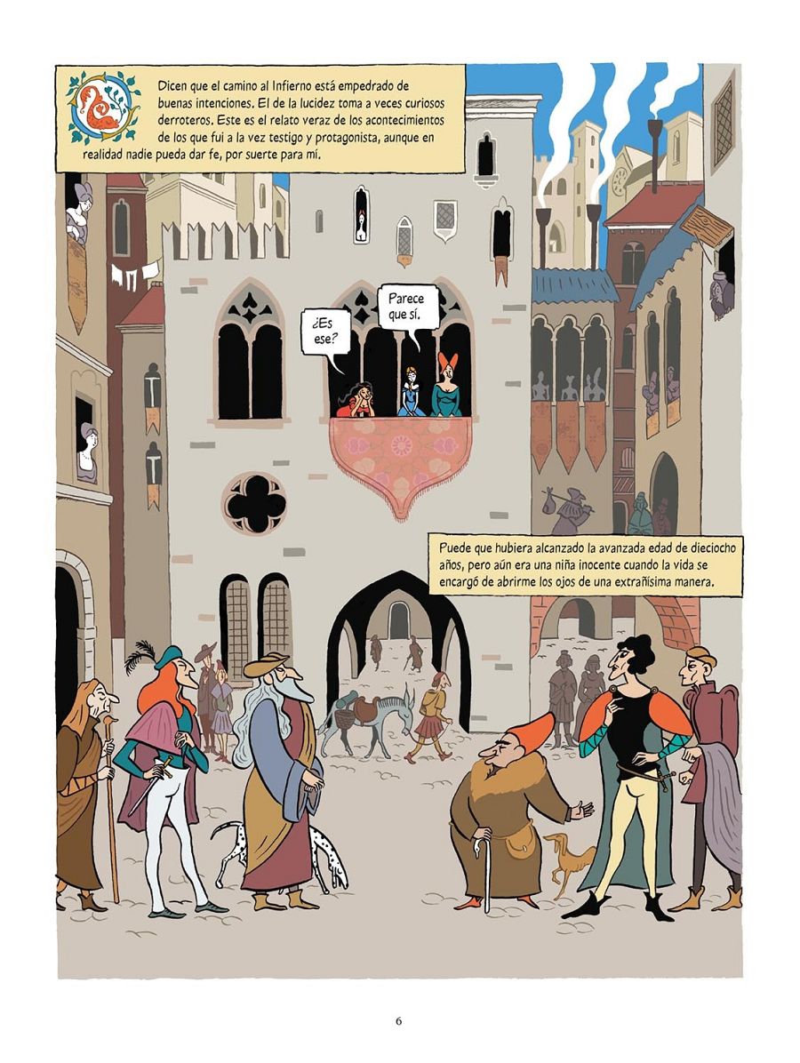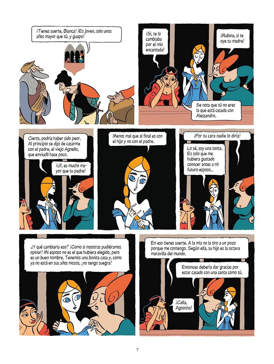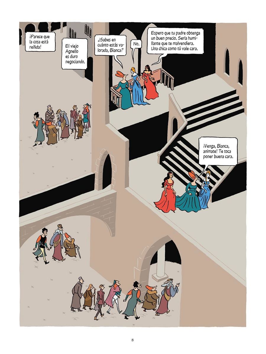 De ahí nació este ingenioso guion que toma otra dimensión gracias a los fabulosos dibujos de Zanzim (La isla de las mujeres). El artista se inspira en la época dorada del Renacimiento en Italia, el 'Cinquecento' y elige un dibujo muy caricaturesco y expresivo, a la par que refinado. Una elegancia visual que potencia eliminando todo lo accesorio, desde los recuadros de las viñetas hasta las sombras de los personajes. Y una vez que los lectores ya saben donde están los personajes, también elimina los fondos. De esta forma consigue una lectura muy clara y concisa. También destaca su maravilloso uso del color, en donde destacan tres tonos, el rojo, el verde y el azul.