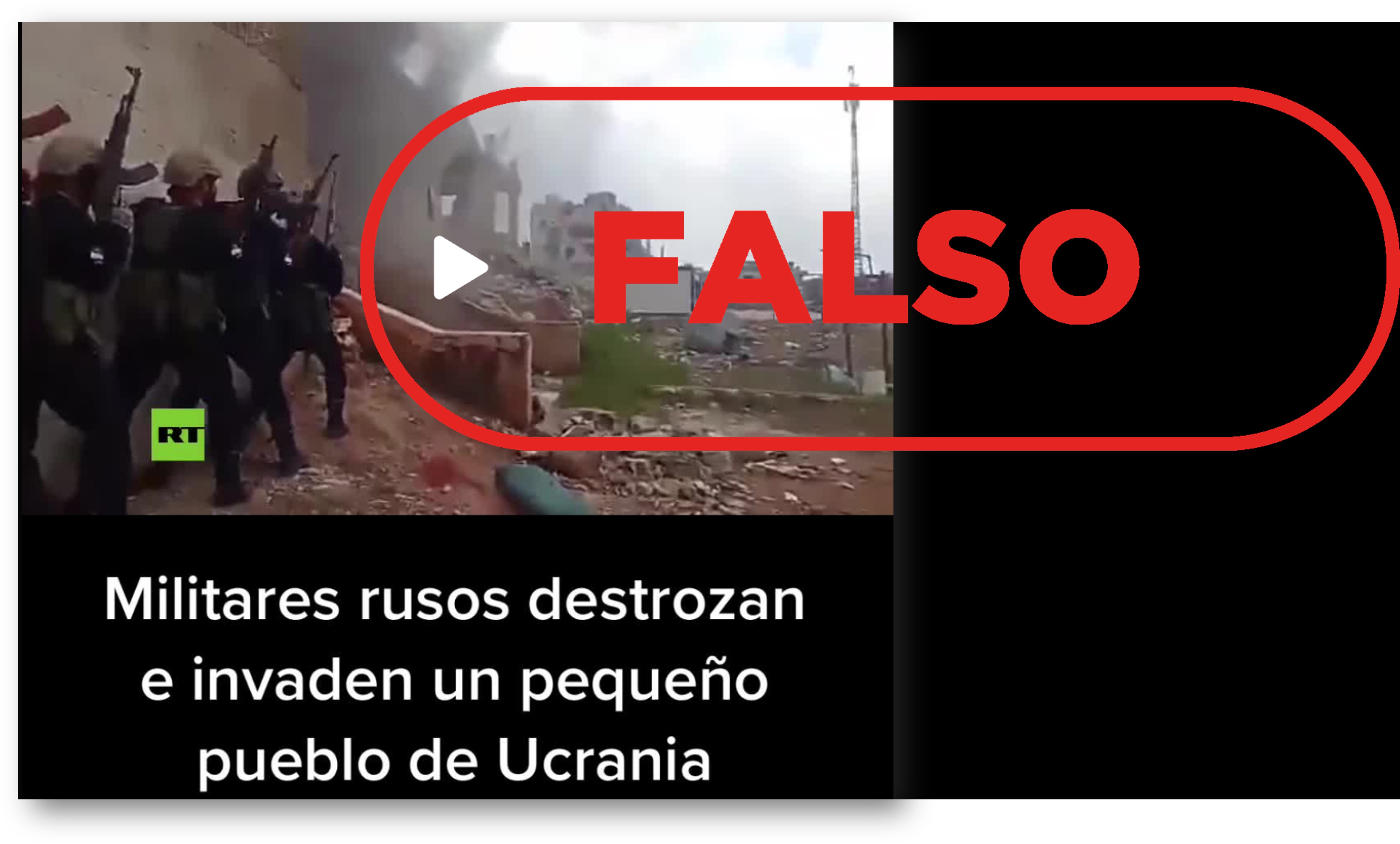 El video que se está difundiendo por Tik Tok está acompañado por un texto en castellano en el que se puede leer “Militares rusos destrozan e invaden un pequeño pueblo de Ucrania”. En la imagen se observa el logo de la cadena de televisión pública rusa RT y lo han visualizado hasta el momento 33.500 usuarios. Se trata de un vídeo antiguo que ya apareció en marzo de 2019 en Internet. Por tanto, es falso que se trate de un ataque ruso real a un pueblo de Ucrania vinculado a la crisis actual.
