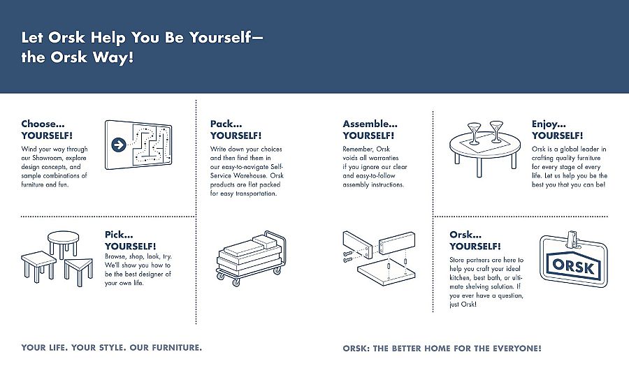 Eso permite al autor hacer también una divertida, pero despiadada, crítica de la sociedad de consumo actual a través de los empleados de esta tienda de muebles llamada Orsk, que no es otra cosa que una parodia de Ikea (pero en cutre y con muebles más baratos).