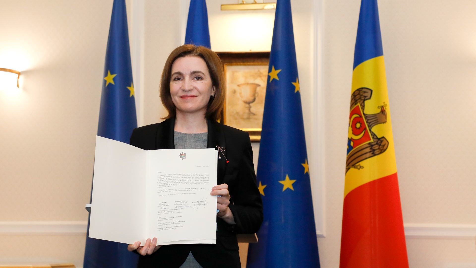 "Hoy firmamos la solicitud de adhesión de la República de Moldavia a la UE", ha declarado la presidenta proeuropea antes de firmar el documento en una ceremonia televisada en Chisinau. "Va dirigida a Emmanuel Macron, el presidente de Francia, que desempeña la presidencia del Consejo de la Unión Europea", explicó Sandu, según el portal de noticias Unimedia.
