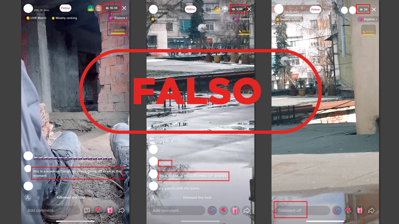 Habitualmente estas emisiones en TikTok son largas. En algún caso superan las 4 horas y durante todas ellas se escucha el sonido de sirenas. Las grabaciones analizadas comparten el mismo sonido de fondo, pero esta alarma antiaérea no tiene nada que ver con la sirena utilizada por las autoridades de Ucrania para advertir a la población civil, según hemos visto en otras localizaciones del país (Kiev, Leópolis, Zaporiyia y Járkov). La alarma que suena en los vídeos falsos se asemeja a este otro sonido subido por un usuario a YouTube.
