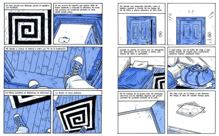 En la primera viñeta del cómic nos encontramos ya con una espiral dibujada en la alfombra de la habitación a la que entra el protagonista. Un intrigante elemento que se repite durante toda la obra. “Esa espiral tiene muchas lecturas diferentes –confiesa Madden-, entre ellas la idea de la locura o la desorientación que el protagonista sentirá al leer esas historias y que compartirán los lectores. También estaba la idea de seguir la espiral hasta el fin, como hace Alicia en Alicia en el País de las Maravillas. El problema es que es una espiral infinita que nunca llega al final”.