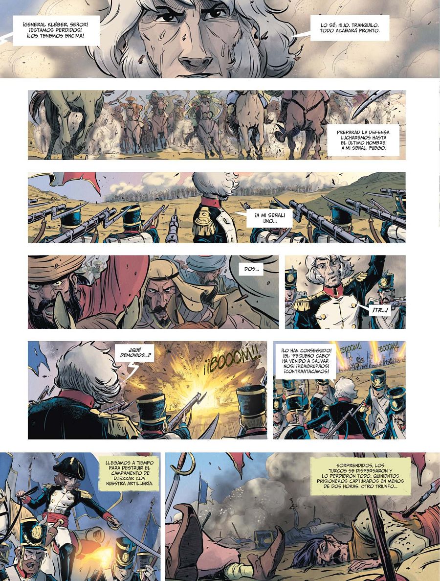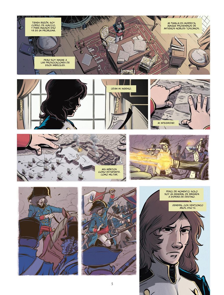 Destacar el apartado artístico, a cargo del dibujante Cesc Dalmases (Victus) y el colorista Roger Surroca. Todos tenemos la imagen de un Napoleón maduro, por eso preguntamos a Cesc de dónde sale este personaje que está a punto de cumplir los 30. “Hay muy pocos retratos de su juventud, como uno de Antonie Jean-Gros de cuando tenía 27 años y en el que se lo ve con el pelo largo. Me he basado en ellos, pero pasándolo por mi filtro, intentado convertir a un personaje histórico en el héroe de una aventura, porque eso es este cómic, una gran aventura”.
