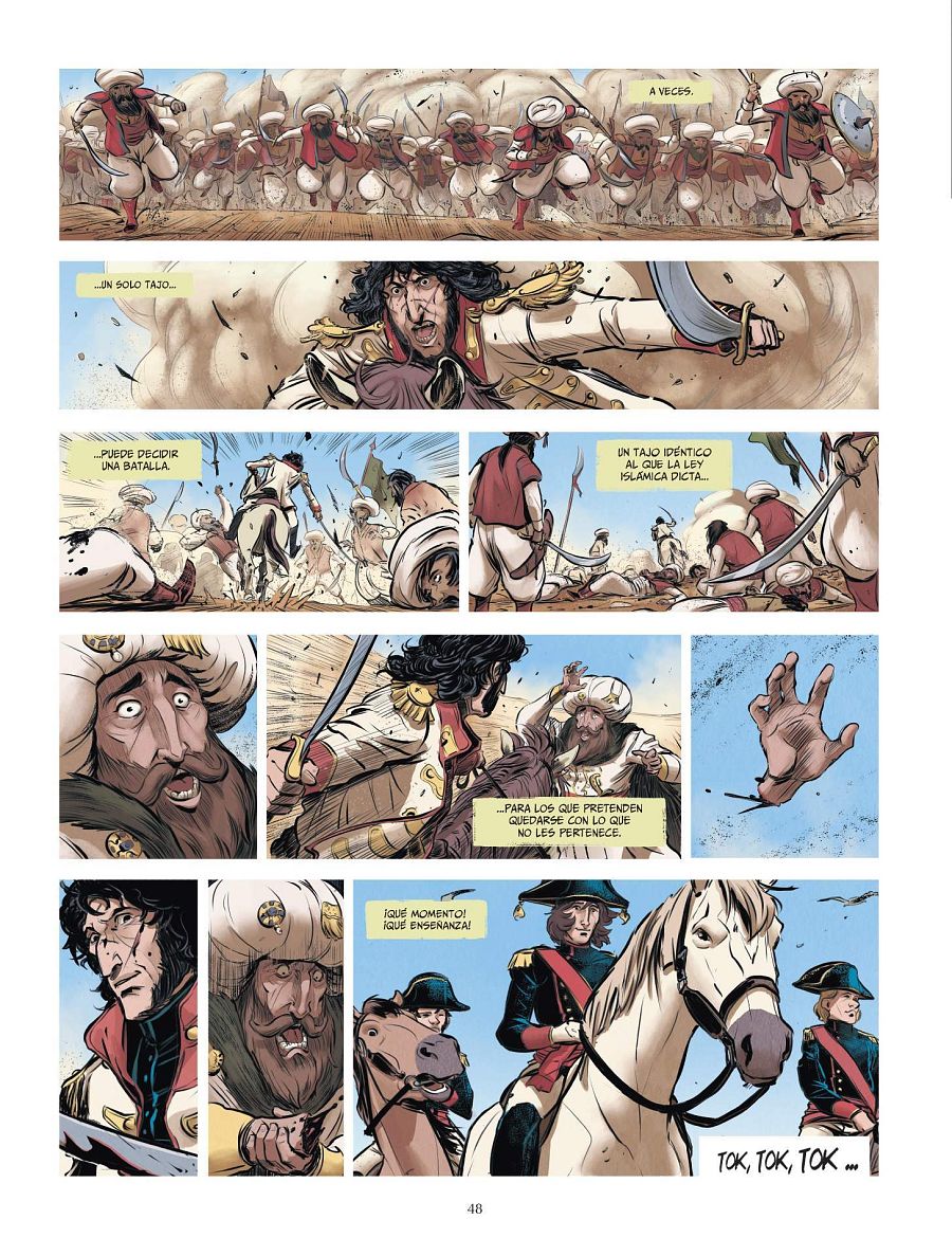 Para documentarse Cesc vió los grabados de la época que muestran a Napoleón en Egipto. “Sí –asegura-, son muy útiles como documentación. Pero nunca he buscado una estética que recordase a la época, sino que quería que el dibujo tuviera una voz propia y fuera muy actual y muy cinematográfico. Como una gran superproducción”.