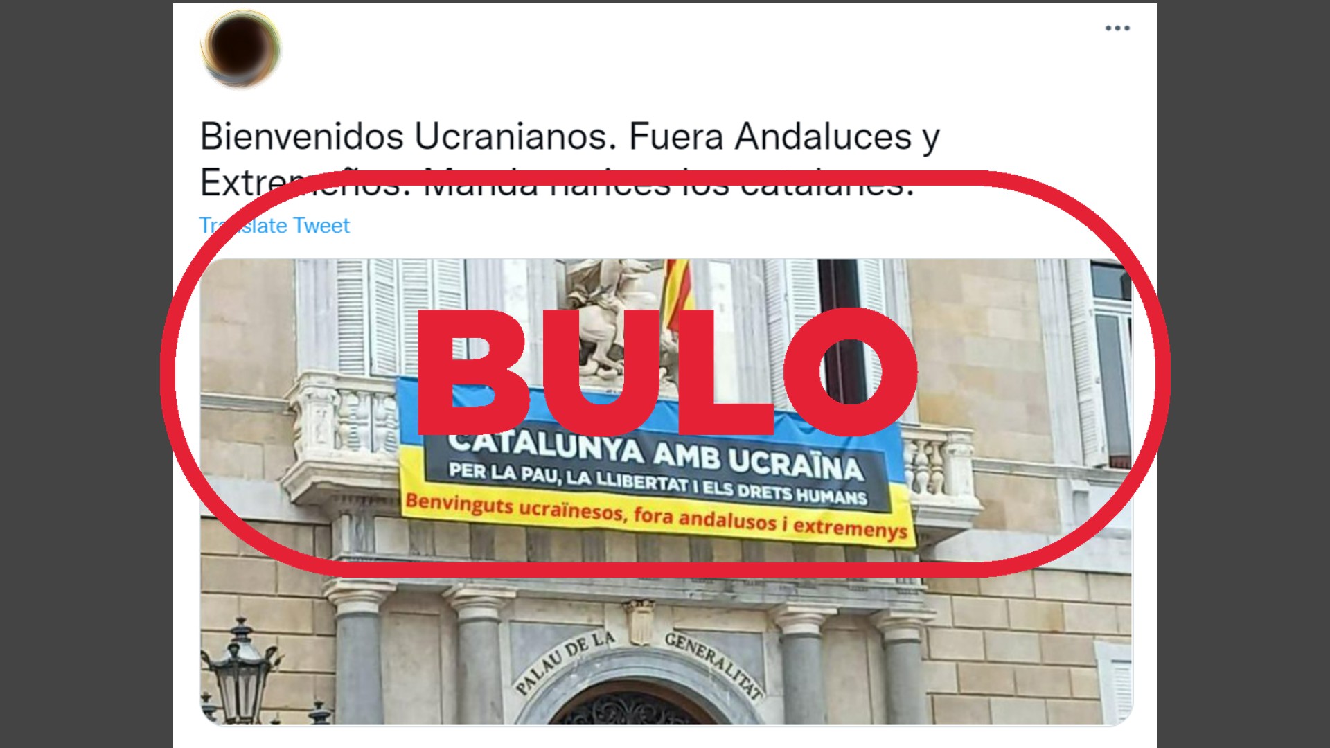 Se ha difundido en redes la imagen de una supuesta pancarta colgada en el Palacio de la Generalitat de Cataluña que da la bienvenida a los ucranianos y pide la salida de extremeños y andaluces. Es un bulo. Se trata de un montaje a partir de un cartel real que se solidariza con la situación en Ucrania.