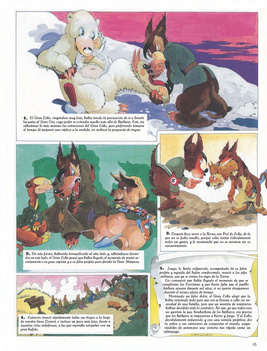 Siendo estrictos deberíamos señalar que Calvo no fue el primero en narrar la Segunda Guerra Mundial con animales, ya que el caricaturista francés nacido en Alemania, pero de ascendencia judía, Horst Sigmund Rosenthal (1915 - 1942), dibujó en 1942, mientras estaba prisionero en el campo de internamiento de Gurs, el cómic Mickey au Camp de Gurs. En esa obra contaba cómo Mickey Mouse es arrestado, bajo sospecha de ser judío, e internado en el campo de concentración de Gurs. Pero Horst fue ejecutado en 1942, en Auschwitz, y su cómic no se publicaría hasta 2014, 72 años después de haber sido escrito.