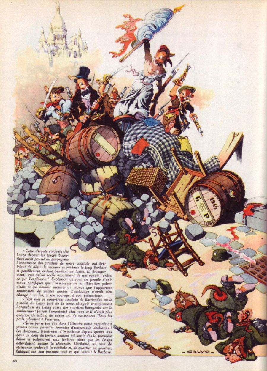 Destacar, como decimos, las maravillosas ilustraciones de Edmond-François Calvo, al que se calificó como “el Walt Disney francés”, porque su estilo recuerda mucho a Disney. Pero también estaba muy influenciado por los dibujos animados de Tex Avery (Bugs Bunny), lo que explica el dinamismo de los personajes, su expresividad y la profusión de detalles de sus páginas, que podemos estar escrutando durante horas. Ya que siempre encontraremos nuevos y sorprendentes detalles, sobre todo en sus grandes ilustraciones de batallas, con cientos de animales y objetos implicados.