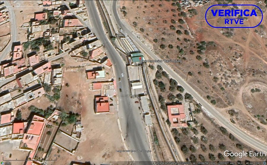 Geolocalización sobre mapa Google Earth Pro del paso fronterizo en Melilla (con sello VerificaRTVE). VerificaRTVE