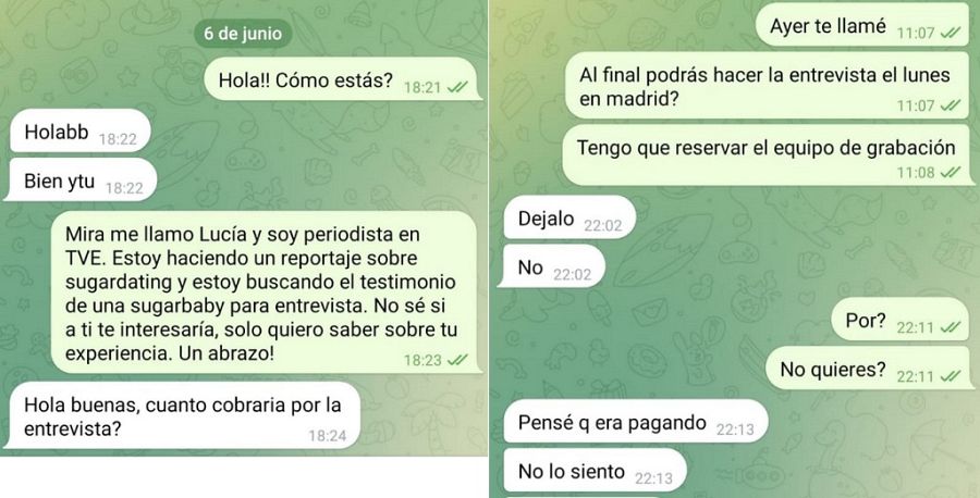 Todas las Sugar Babies con las que contactamos se reafirmaban en una misma idea: sus relaciones con estos hombres eran totalmente consentidas y no tenían ningún tipo de miedo. Sin embargo, cuando se les pedía una entrevista, la mayoría no accedía. Como muchas ocultan a sus familiares, conocidos o en el trabajo que realizan este tipo de servicios, era comprensible que no quisieran aparecer en pantalla. Pero cuando se les aseguraba que todo sería de manera anónima y que, en ningún caso, se las reconocería, reiteraban su negativa.