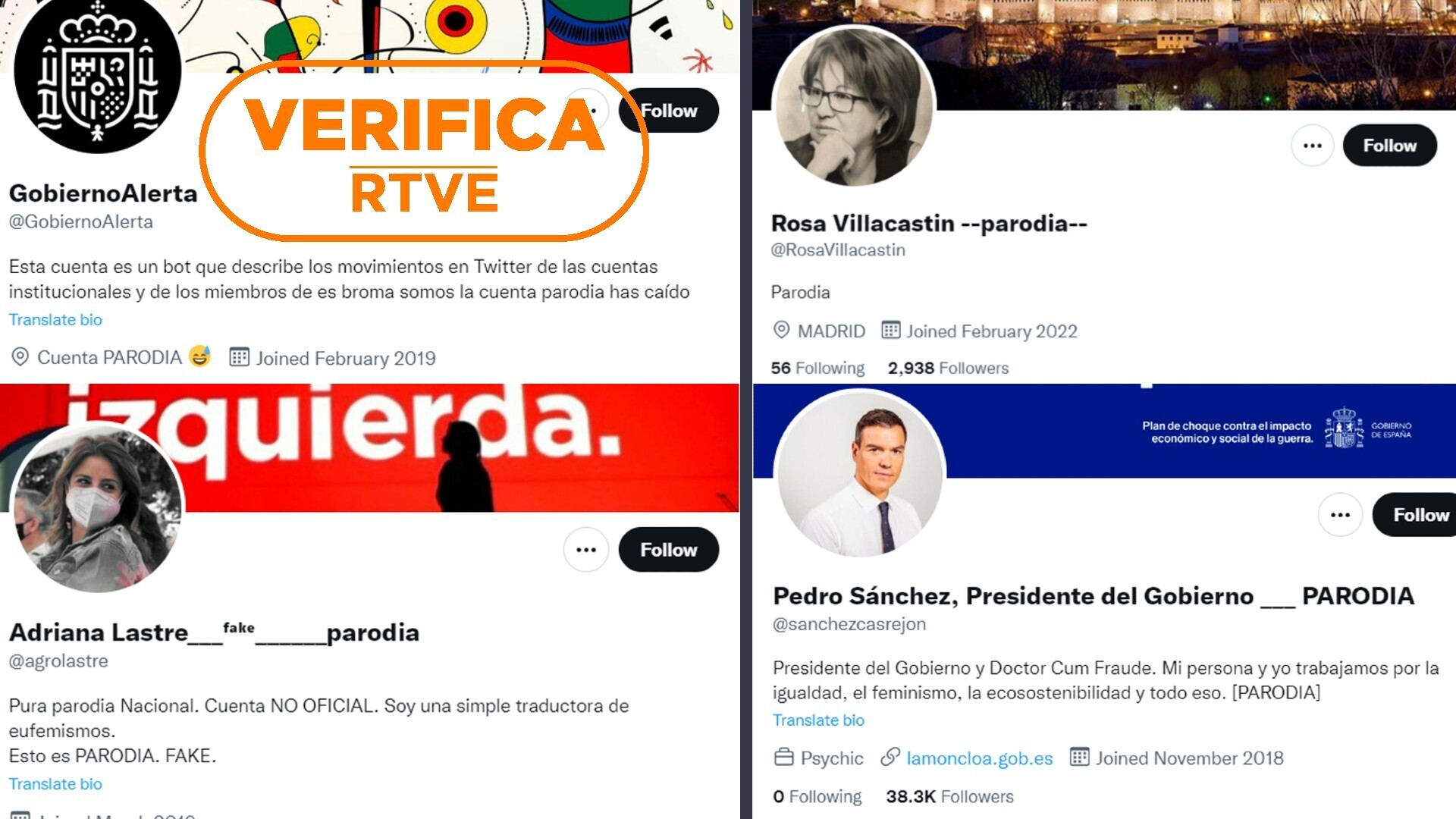 La cuenta supuestamente paródica @sanchezcasrejon acumula 38.200 seguidores con un perfil que copia las fotos, el nombre e incluso el enlace a la página web de la Moncloa. Aunque ha publicado mensajes engañosos que han llevado a diversos usuarios a criticar la suplantación, este perfil sí cumple con las dos normas que marca la política de Twitter: el nombre y la descripción incluyen la palabra “parodia”.