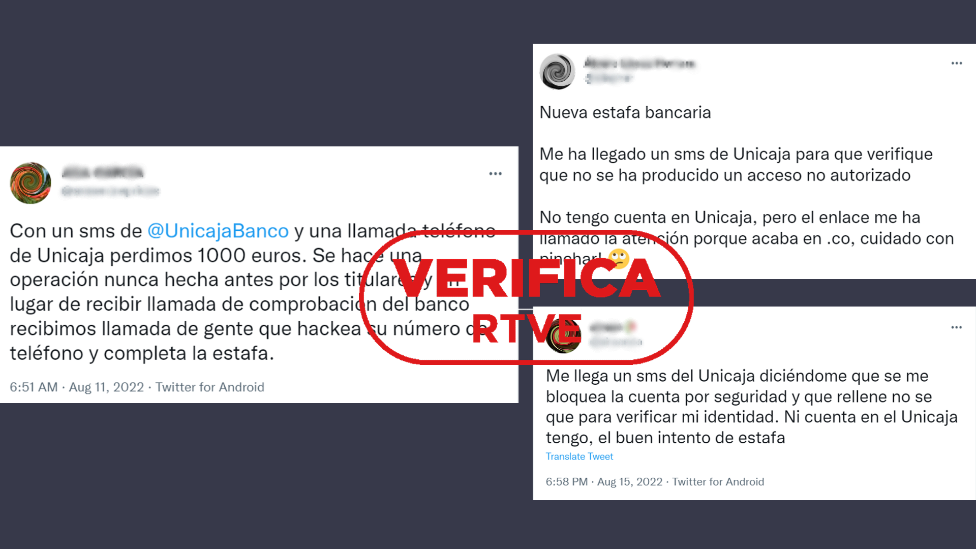 Una usuaria en Twitter dice: “Con un sms de @Unicajabanco y una llamada teléfono de Unicaja (SIC) perdimos 1000 euros”. El mensaje explica que “se hace una operación nunca hecha antes por los titulares” y añade: “en lugar de recibir llamada de comprobación del banco recibimos llamada de gente que hackea su número de teléfono y completa la estafa”. También leemos los testimonios de otras personas que denuncian haber recibido estos mensajes falsos, incluso algunos sin ser clientes de la entidad bancaria (1, 2 y 3).