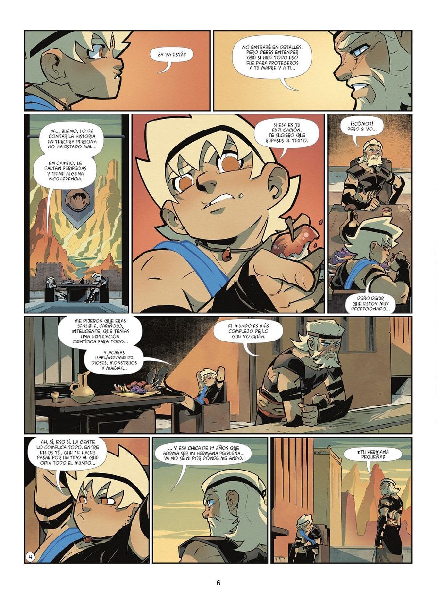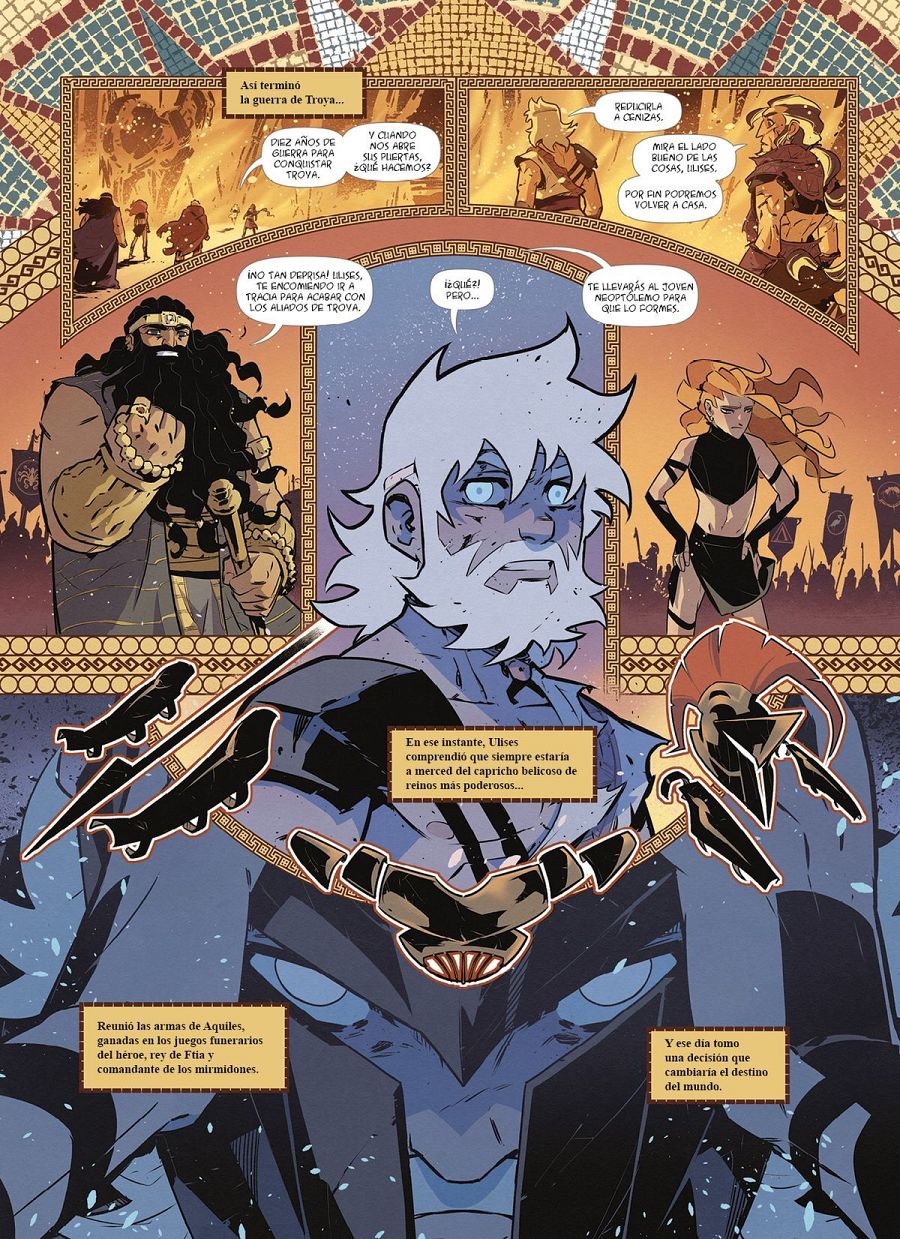 Destacar también que cada tomo resume la historia, en la primera página, con el estilo de los mosaicos griegos. "Eso lo hicimos porque me encantan los prólogos de las películas de los 90 de Disney. Por ejemplo, en La bella y la Bestia te cuentan el prólogo de la historia con las vidrieras del castillo. Me parece que es una manera estupenda de poner al espectador en el contexto de la historia que va a descubrir, utilizar el arte de la época en la que se va a ambientar".