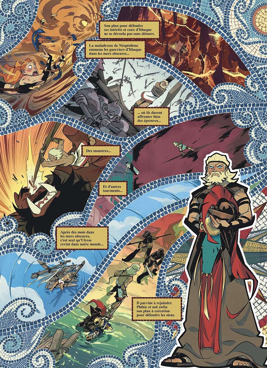 "Por eso buscamos algunas ideas parecidas -confiesa-. La verdad es que la peli de Hércules de Disney nos dejó sin las más brillantes, pero llegamos a esto de los mosaicos y junto a Noiry trabajé para crear unos pinceles específicos que nos permitían dibujar estos mosaicos. Son páginas con las que me lo paso muy bien porque, además, tienen mucho fan service. Si eres fan de La Odisea es la oportunidad de dibujar a dioses o a otros reyes que no aparecen tanto en la serie".