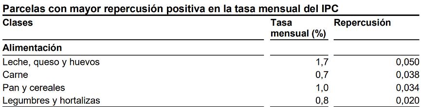 Detalle del último informe sobre el IPC que muestra un incremento mensual de algunos alimentos. Fuente: INE VerificaRTVE