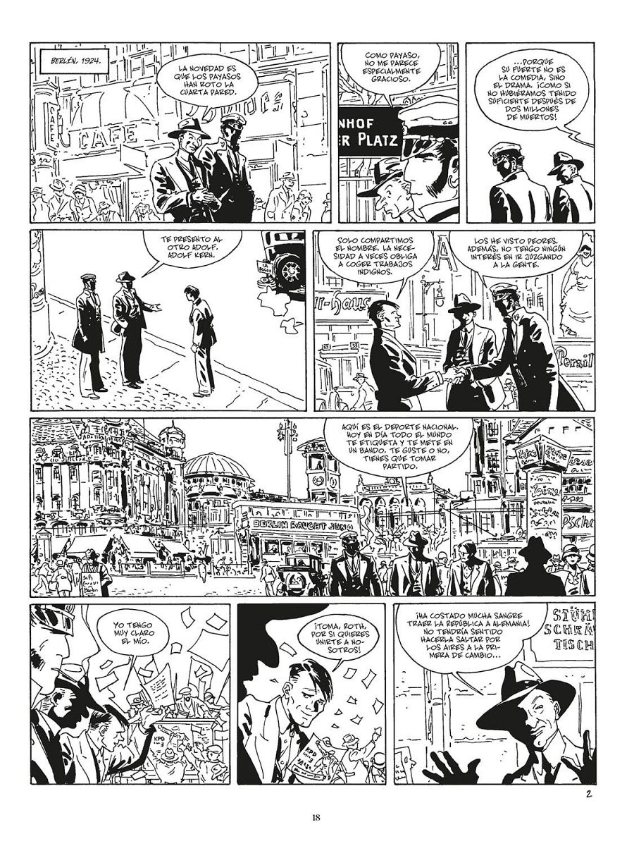 En esa noche berlinesa, Corto conocerá a un actor de teatro llamado Adolf, que guarda un gran parecido con ya sabéis quién. ”Es una forma de jugar con la ambigüedad que había en esa época a todos los niveles –nos comenta Díaz Canales-.Es un personaje que trabaja en el cabaret, por lo que, al ser actor, ya es un personaje ambiguo. También jugamos con la ambigüedad sexual. Y, por si fuera poco, lo conocemos interpretando al auténtico Adolf Hitler en una obra de teatro que cuenta su paso por la cárcel. Aunque luego descubriremos que este otro Adolf milita en el Partido Comunista”.