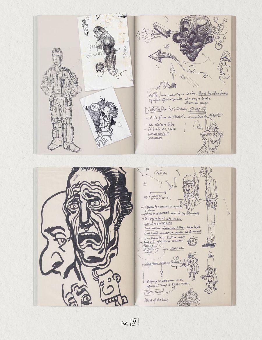 Un volumen que, aparte de ese alucinante material gráfico, viene acompañado del testimono de grandes colaboradores y amigos de Álex de la Iglesia, que nos dan una imágen más cercana y cotidiana del director. Como Cels Piñol, Jordi Sánchez Navarro, Paco Cavero, Borja Crespo,Xavier Garriga, Juan Torres o Carolina Bang, su esposa y productora, que nos cuenta una divertida anécdota sobre una estatua de Hulk, de tamaño real, que regaló a Álex por su cumpleaños.