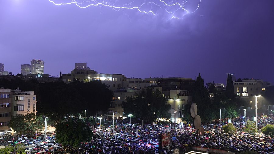 Los manifestantes han llenado la plaza Habima de Tel Aviv para expresar su rechazo a una iniciativa que otorgaría más poder al Ejecutivo en detrimento de la Justicia, cuya independencia se vería profundamente debilitada.