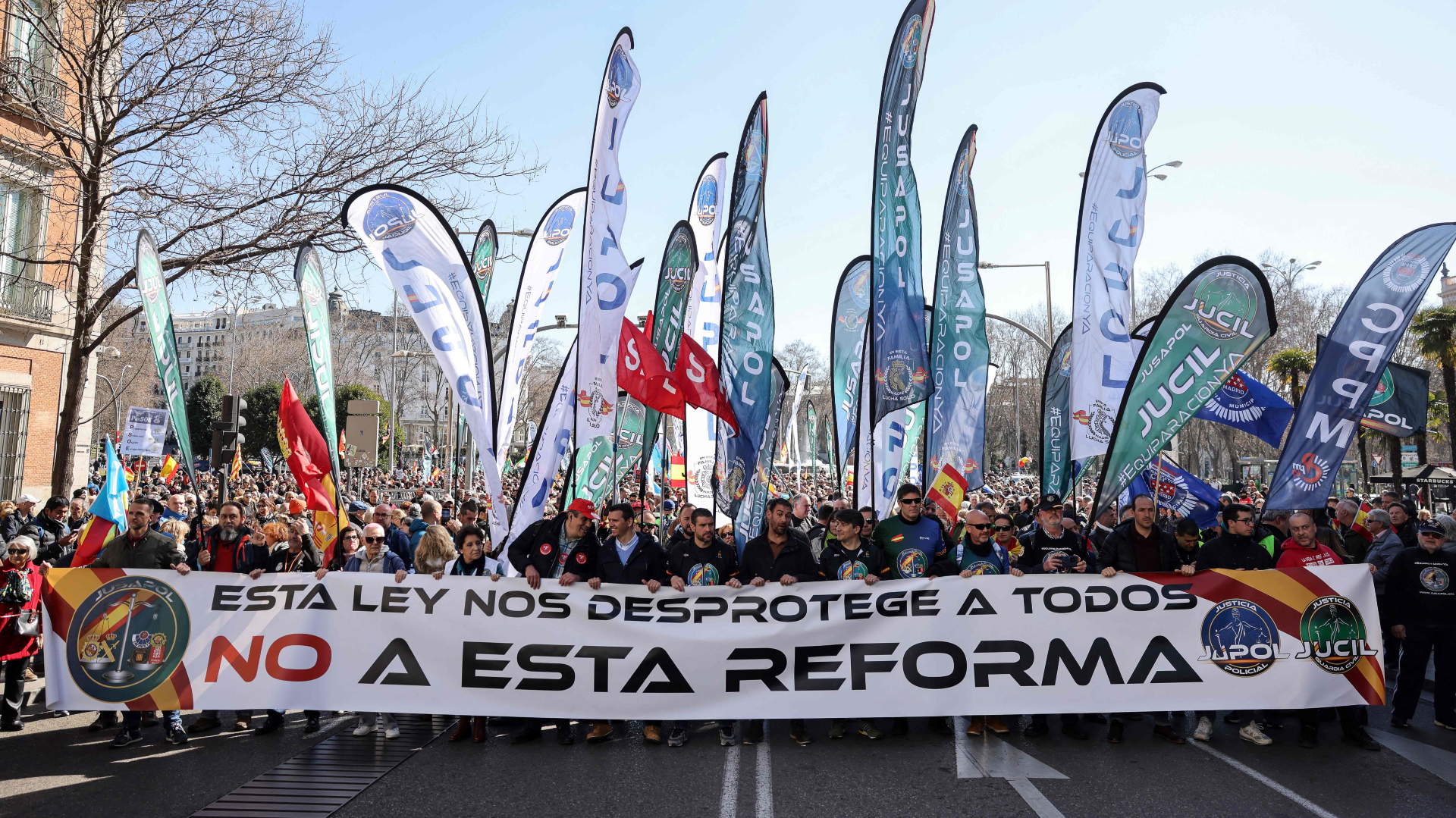 La manifestación, en la que han participado alrededor de 4.000 personas, según fuentes de la Delegación del Gobierno, ha sido convocada por Jusapol, junto al sindicato de la Policía Nacional Jupol y la asociación de la Guardia Civil Jucil, mayoritarios en sus respectivos cuerpos, y ha estado apoyada por la Central Sindical Independiente y de Funcionarios (CSIF).