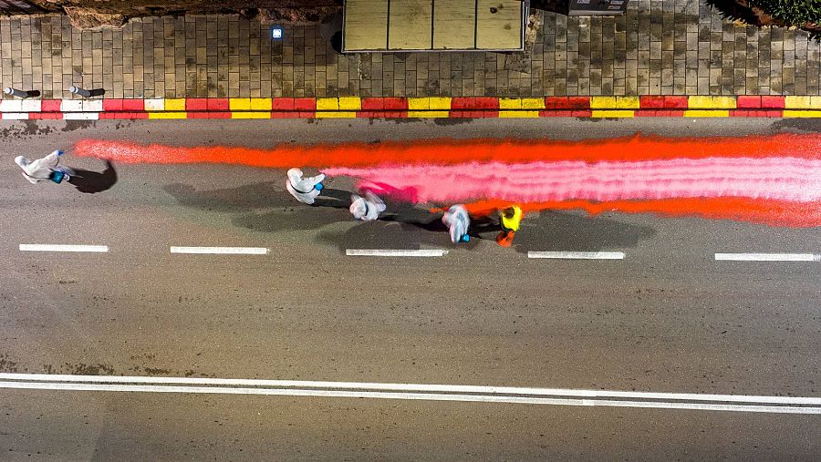 Manifestantes pintado una línea roja en la calle que lleva al Tribunal Supremo en Jerusalén.