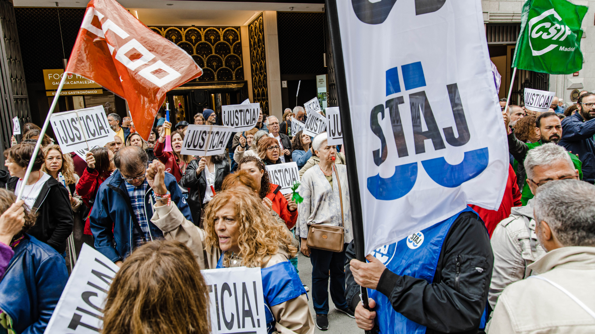 Alrededor de un centenar de delegados sindicales de CSIF, STAJ, CCOO y UGT ha hecho lo propio este viernes frente al Ministerio de Hacienda y Función Pública para reclamar a este departamento y al Ministerio de Justicia su intervención en el conflicto, ya que la última vez que las partes se sentaron a negociar fue el 24 de abril.