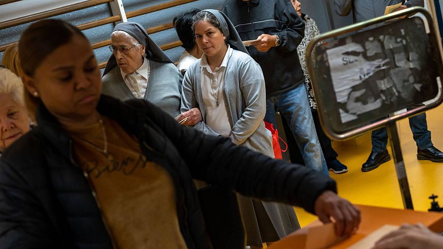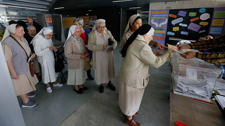 Unas monjas hacen cola para ejercer su derecho al voto este domingo durante las elecciones municipales y autonómicas. EFE/ Fernando Villar