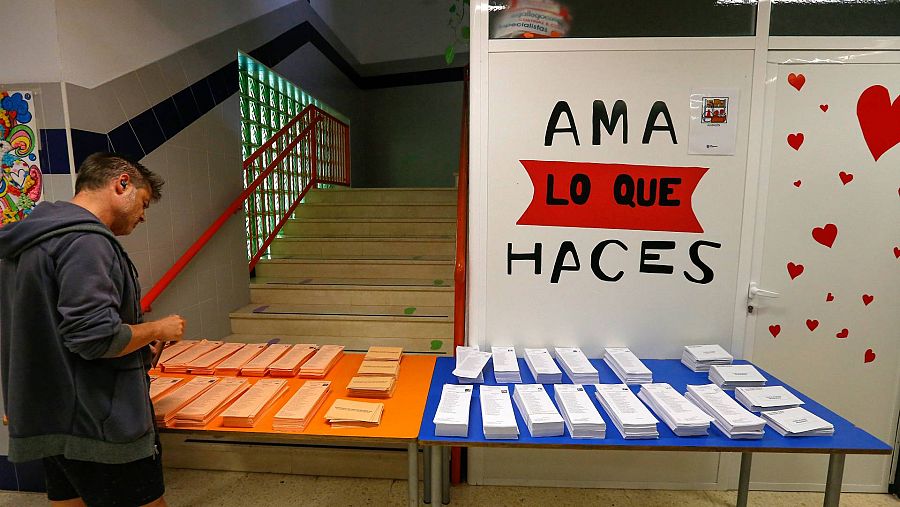 Un votante frente a las papeletas de voto en un colegio electoral en Alicante. EFE/ Manuel Lorenzo