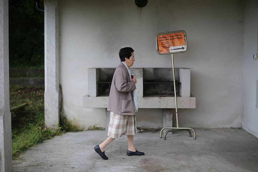Una mujer acude a ejercer su derecho a voto en la mesa electoral colocada en el local parroquial de Recelle (Galicia). La mesa agrupa a varias aldeas del entorno como son Portomarín y O Páramo, en Lugo.