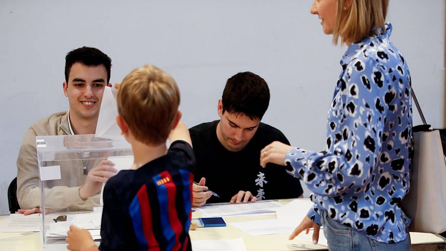 Un niño, con la camiseta del FC Barcelona, deposita el voto de su madre en un colegio electoral de Barcelona, este domingo en el que se celebran las elecciones autonómicas y municipales.