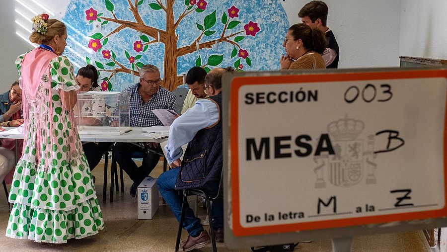 Una mujer ejerce su derecho al voto, vestida de flamenca, para las elecciones autonómicas y municipales este domingo 28 de mayo en el colegio electoral de la aldea almonteña de El Rocío (Huelva), antes de ir de romería.