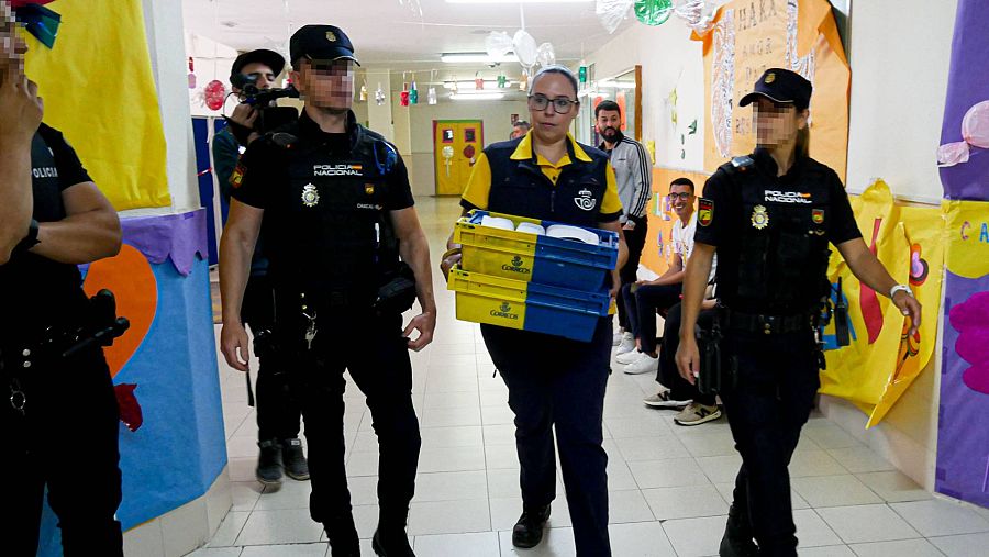 Varios agentes escoltan a la funcionaria de Correos a la mesa electoral para entregar los votos por correo. EFE/ Paqui Sánchez
