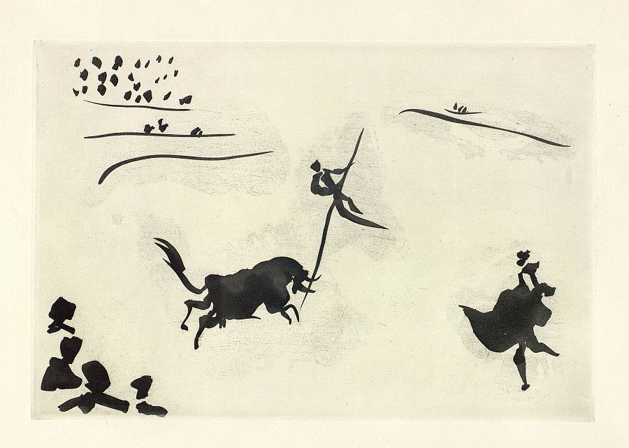 La serie de Picasso fue un encargo que le hizo antes de la guerra civil Gustavo Gili Roig para ilustrar un tratado del diestro José Delgado, "La tauromaquia o el arte de torear", pero quedó aparcado hasta 1957, cuando lo retomó en su villa de Cannes. Grabó 26 aguatintas al azúcar, más una cubierta a punta seca, todo en una sola tarde, en tres horas y media, unos días después de haber asistido a una corrida en Arles. Es la mirada de un aficionado que saborea distintos momentos de la fiesta en la plaza.