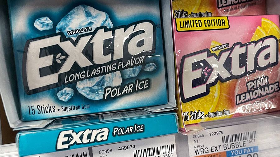 Paquetes de chicles en un supermercado.