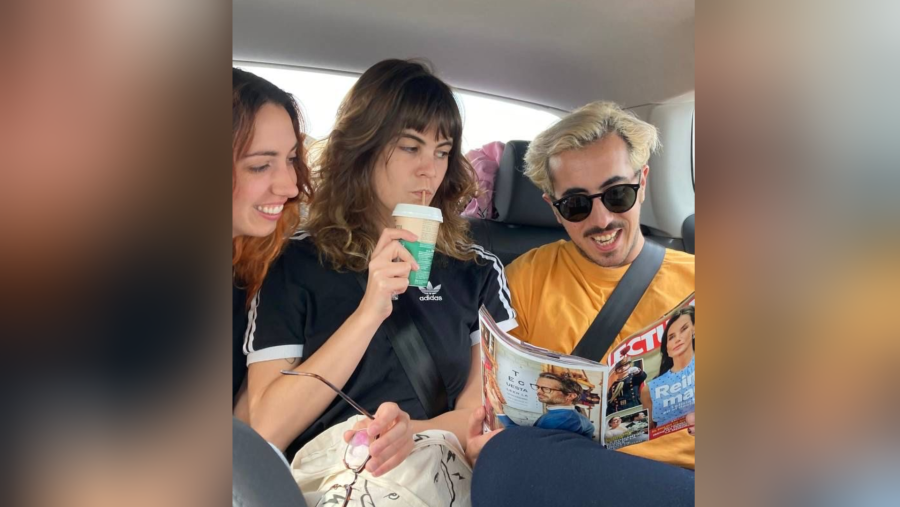 Mónica, María y Mané (integrantes de Jordana B) están entretenidos mientras acumulan horas en la carretera. Guillermo Hernández
