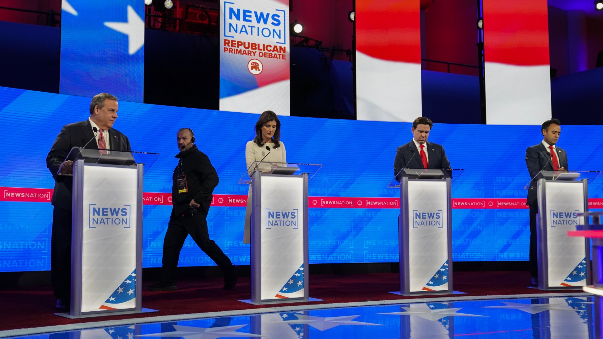 El gobernador de Florida, Ron DeSantis; el empresario tecnológico Vivek Ramaswamy; la exgobernadora de Carolina del Sur y exembajadora ante la ONU Nikky Haley; y el exgobernador de Nueva Jersey Chris Christie fueron los participantes de este evento organizado por el Comité Nacional Republicano (RNC, en inglés) para promover una "agenda conservadora ganadora".